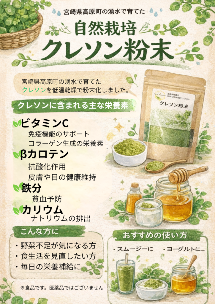 クレソンは生のままだと摂取量が限られますが、粉末にすることで