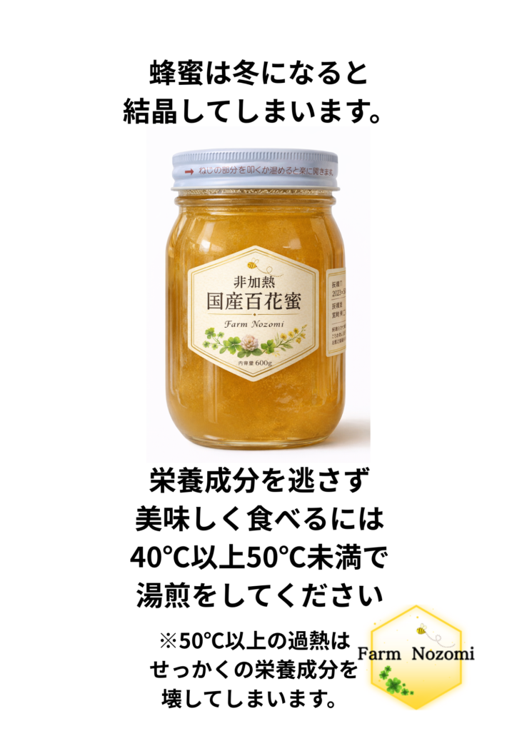 FarmNozomiは非加熱の国産百花蜂蜜を販売しています。
